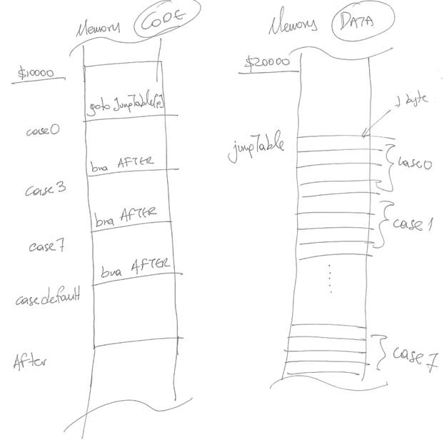 Here every element of jumpTable[] is an address to a piece of code that implements the corresponding case. For example jumpTable[1] contains the address “case1” which should be a label placed at the beginning of the block of instructions that implement case1. JumpTable[2] is “defaultlabel” because when p is 2 we want the code implementing the default case. In memory my code and jumptable will look as follows: